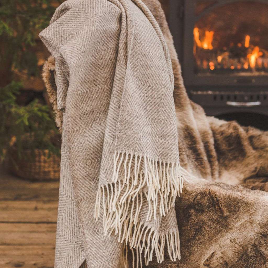 Wool Throw with Fringes “Beige Rombs”