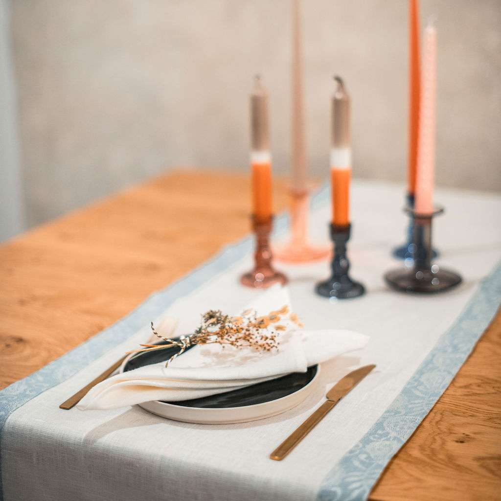 Classic White Linen Runner with Light Blue Paisley Border
