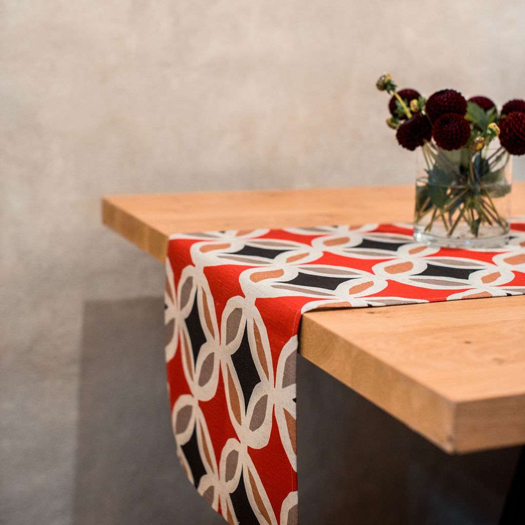 Punane geomeetrilise mustriga linane lauajooks