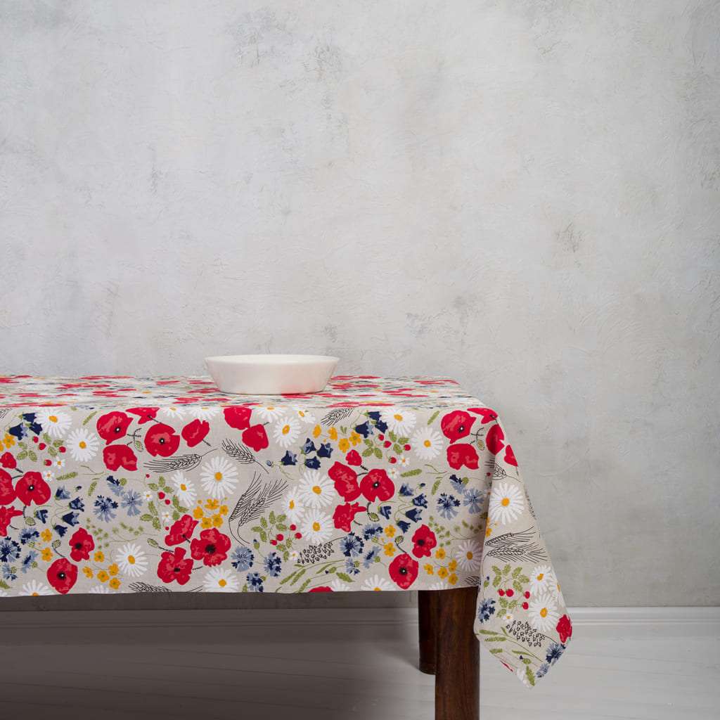 The poppies and daisies linen tablecloth is such a beautiful quality that I also bought the apron. The pattern is sharp and is washable. The foreign order and shipment was track to my door. The purchase was outstanding.