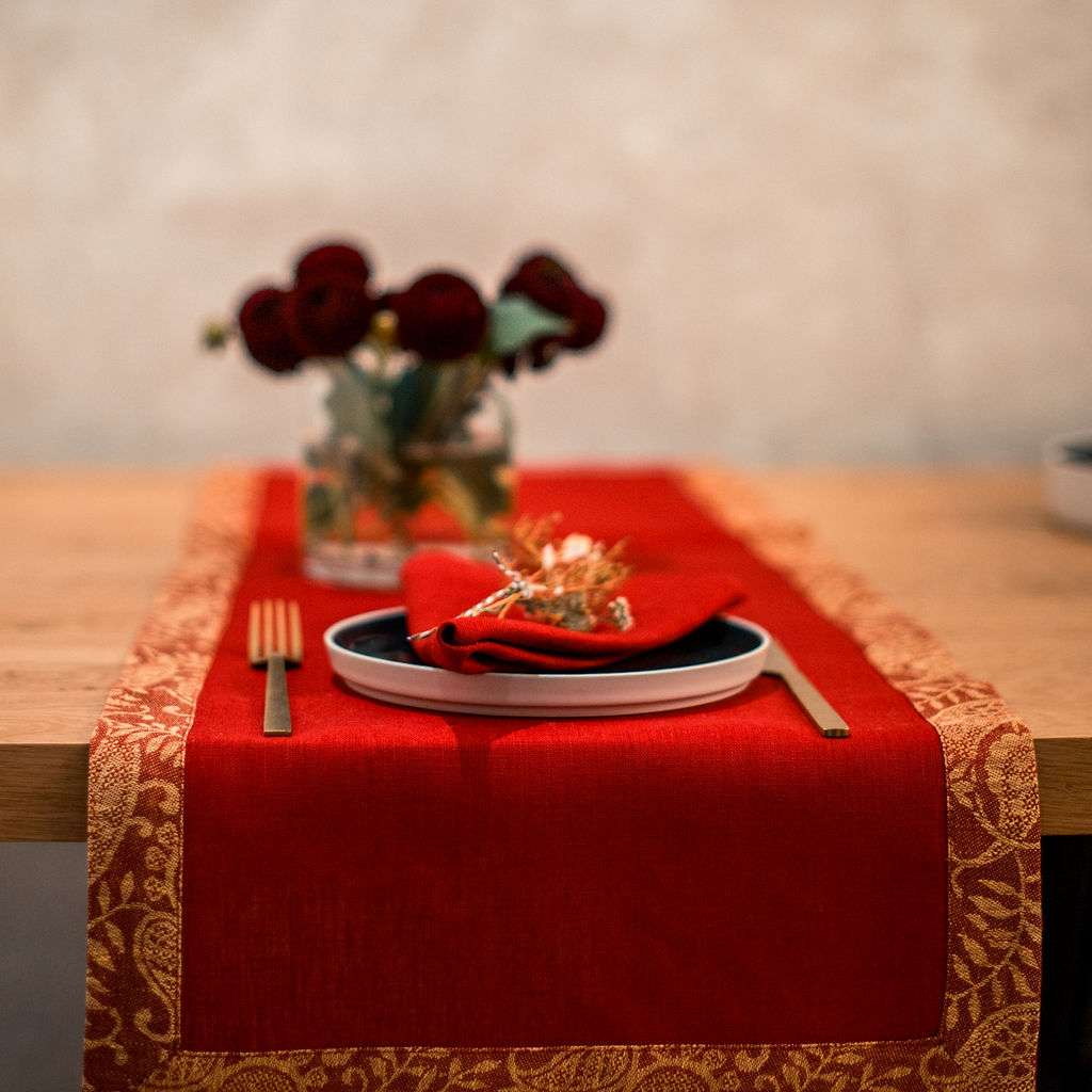 Red Linen Runner with Yellow Gold Paisley Border