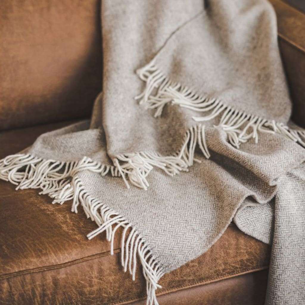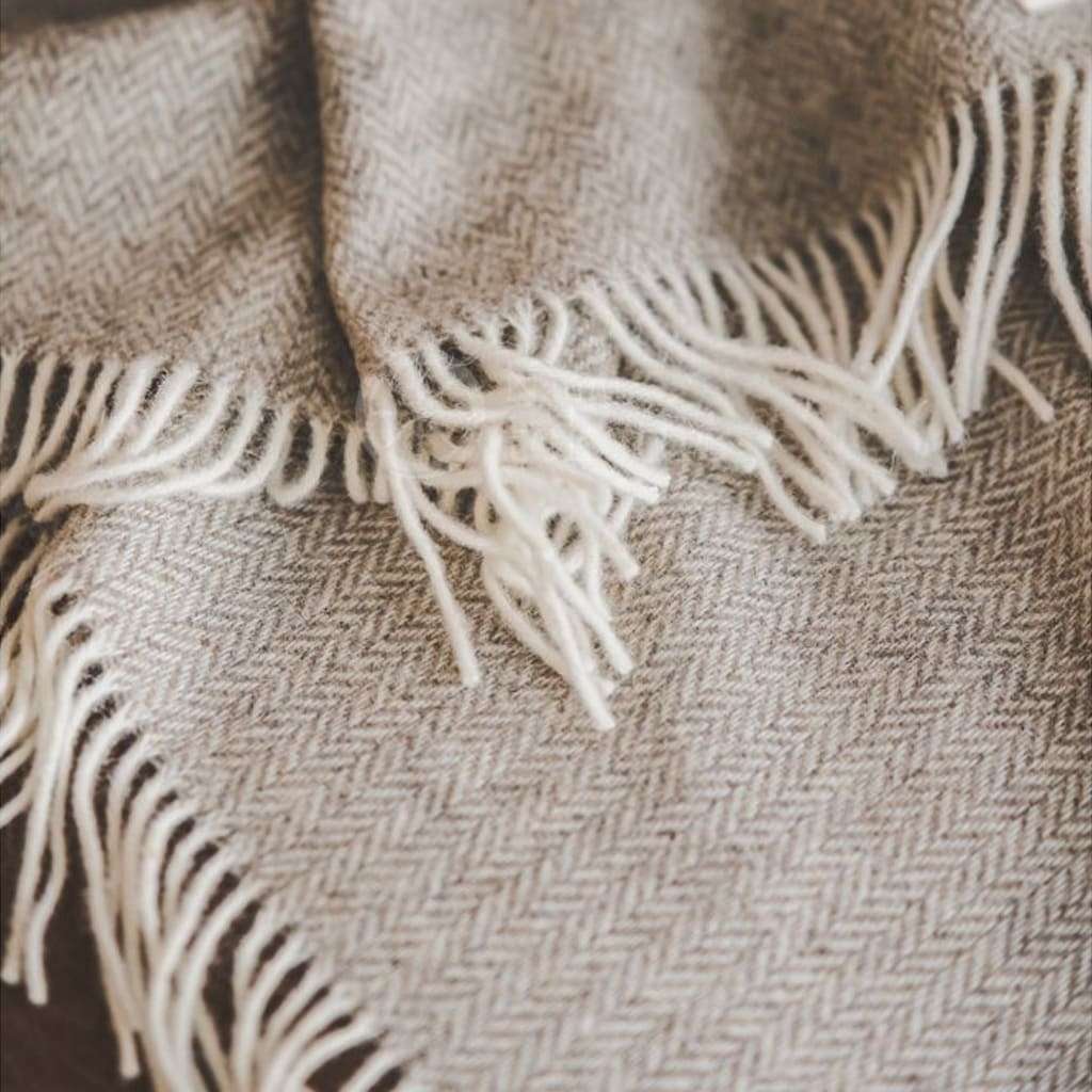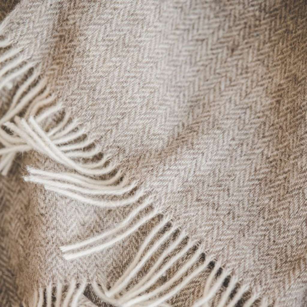 Wool Throw with Fringes “Beige Herringbone Pattern”